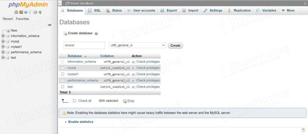 You can create a new database via PHPMyAdmin. Browse to your phpMyAdmin URL (e.g. node1776-laravel.rosehosting.us) using your Internet Web Browser, and log in using your root user login credentials provided to your email.